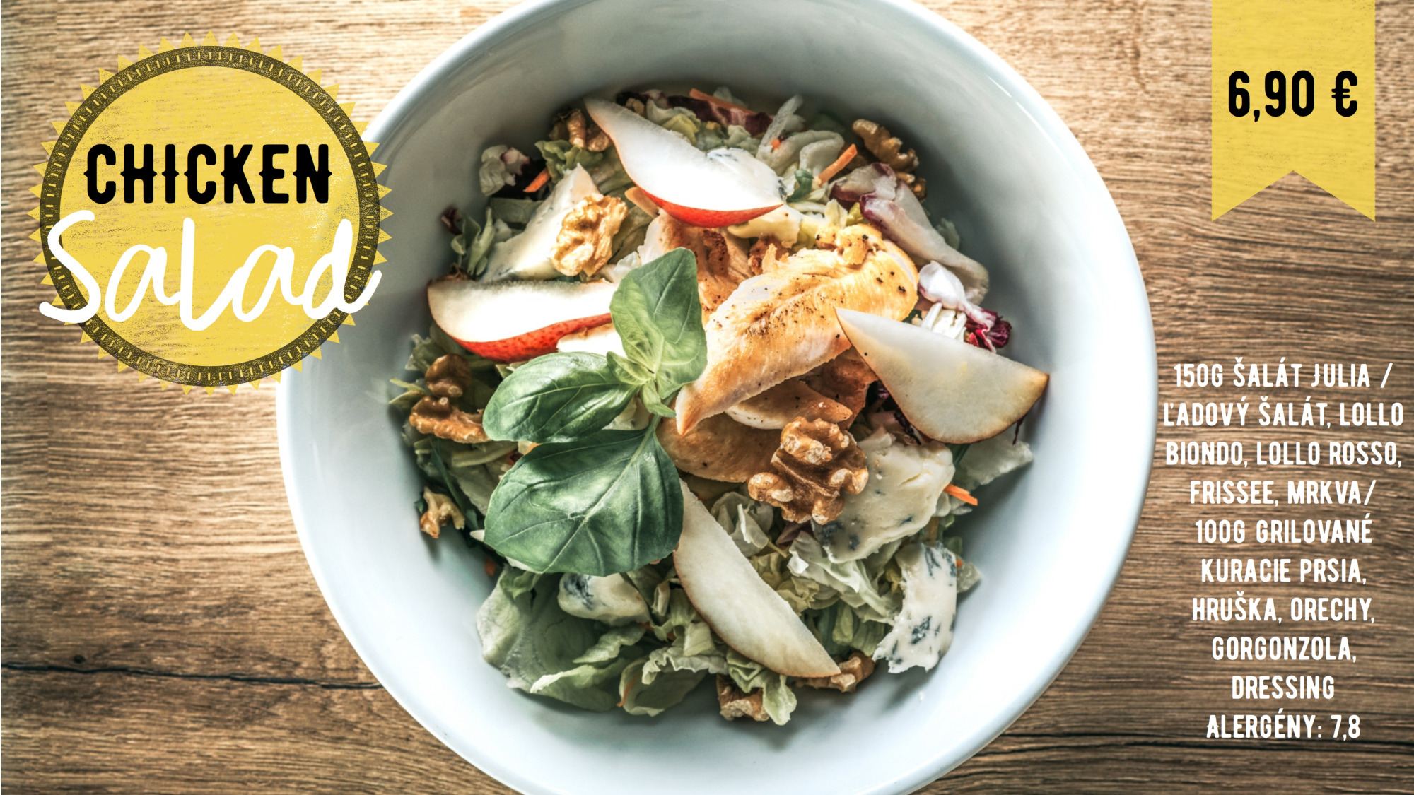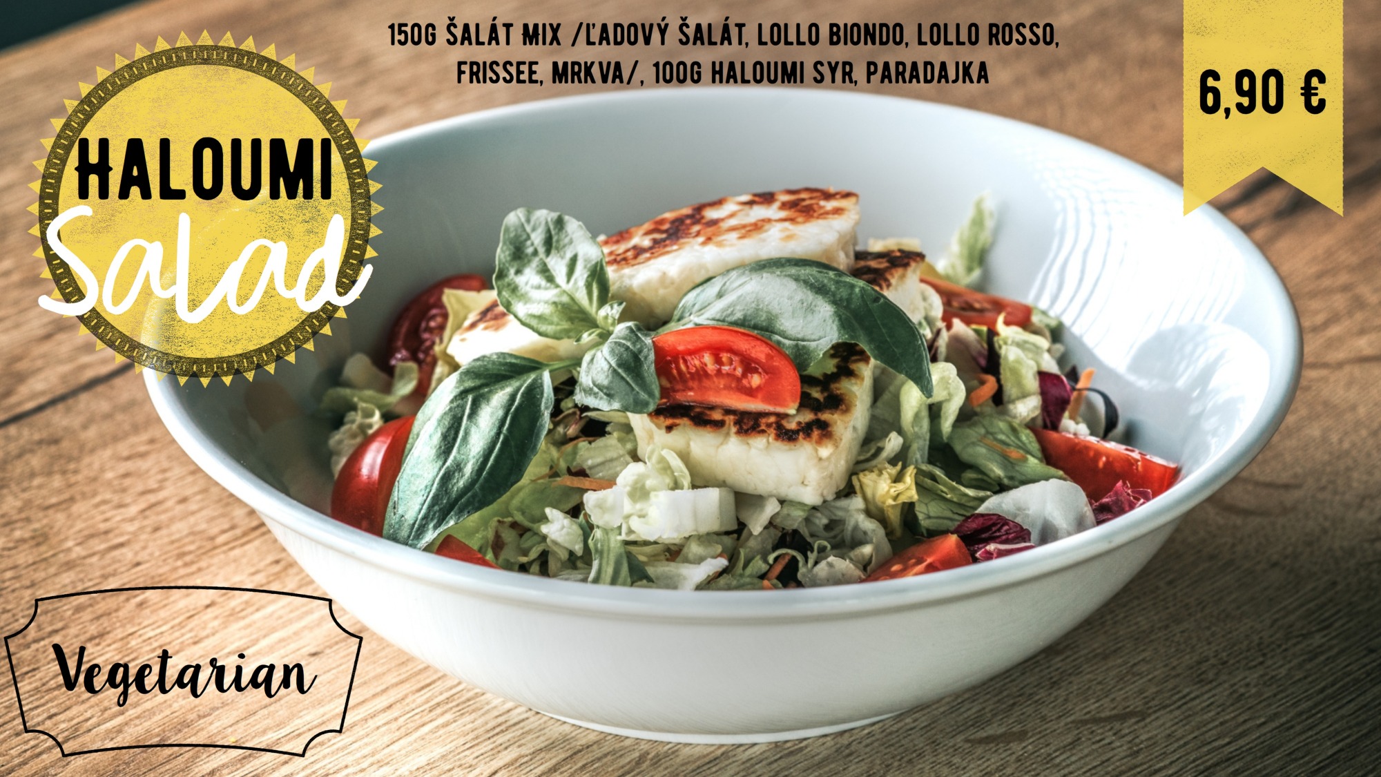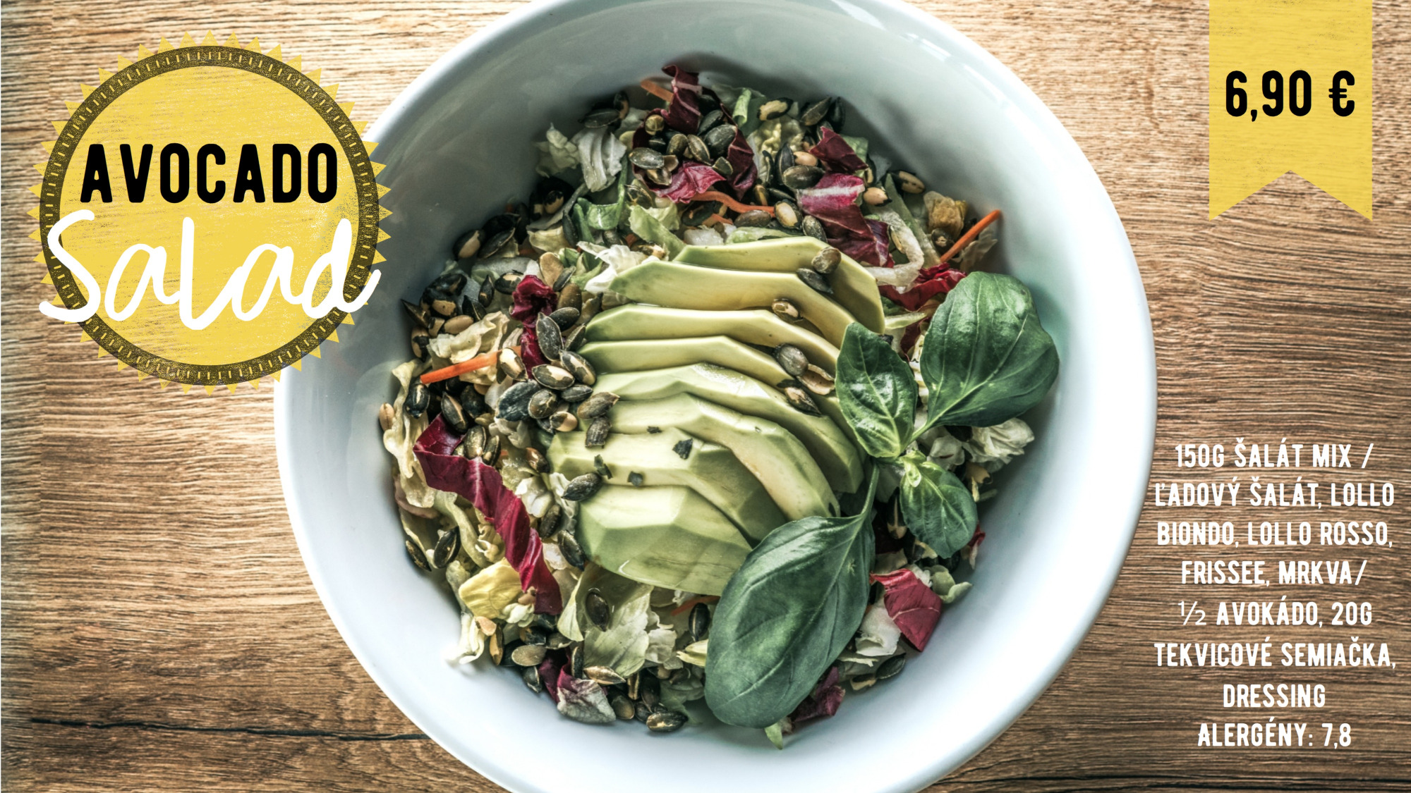 150g šalát mix /ľadový šalát, lollo biondo, lollo rosso, frissee, mrkva/ 80g údený losos, 1 ks varené vajíčko, tortilla